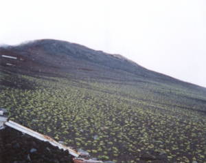 五合目の遊歩道のあたりは「森林限界」といわれるところで、ここから上には木は生えません。栄養のない土でも生えるこけやイタドリが頂上めざしてはい上がろうとしています。