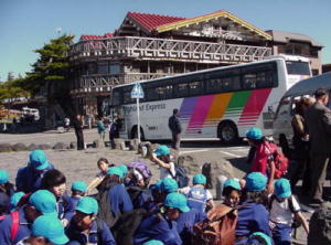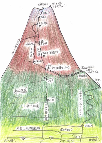 1,河口湖・吉田口 登り6時間、下り3時間15分。 スバルラインで5合目まで行けます。 5合目はにぎやかで、人気のコースです。山小屋もたくさんあります。 2,富士宮口 登り5時間、下り2時間40分 スカイラインで5合目まで行けます。 一番短い時間で登れます。一直線の急な登り道です。 3,須走口(すばしりぐち) 登り5時間40分、下り2時間25分 静かな山道です。下りは砂走りを歩くと1歩で3メートルくらい進めます。 4,御殿場口 登り7時間30分、下り3時間10分 頂上までの道のりが長いので登りには向きません。 おりるのにはいいです。 山小屋 富士山の山小屋は石室(いしむろ)といいます。強い風をさけるためにまわりを石で囲ってあるからです。山小屋はたくさんありますが、予約した方がいいです。山小屋にはトイレはありますが、臭いです。ご飯も出してもらえますが高いです。頂上では、カップヌードルが800円です。水は貴重品なので顔は洗えません。水は必要な分だけ自分で持っていきます。 | ![]() |