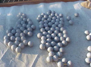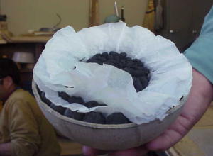 1 玉からの半分の内側に完成した星をなら べていき、かた方の中央に導火線をさし こみます。 2 中央に切れ目のある紙をつめます。これ を一個として計二個作ります。 3 完成した半分づつを両手に持ち一つに 合わせます。この様な製作方法をパック リ法といいます 4 左右を一気に一つに合わせます。 5 外にはみ出した紙をはさみで切った後、 テープで仮止めします。 6 玉ばり。合わせた花火玉の外側に、クラ フト紙(茶色の和紙)等を何重にもかさね ます。これで花火の完成です。(⌒_⌒) | ![]() |