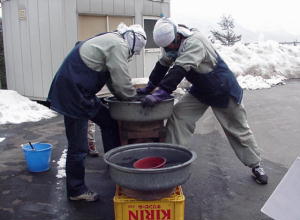 と炎色剤などを混ぜ合わせます。花火制作の