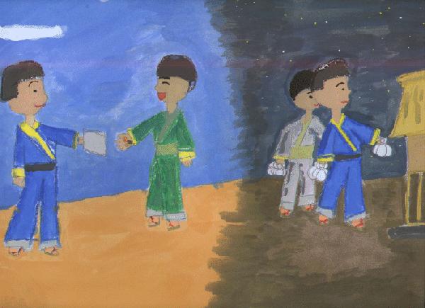 1,渡辺青州は、小さいころ小田切五三郎という名前でした。敷島町の大変よい土地に生まれ、20才の時に市川大門町へ来て渡辺寿の娘ふじのと結婚しました。そして名前を渡辺信に変え、青州と号しました。渡辺家の仕事は紙問屋でした。他にもたくさんの田畑を持っていました。そこで青州は一生けんめい働きました。 ある時日照りやこう水でお米がとれず、人々は草や木の葉までも食べ何とか1日を送るという日がつづきました。そんな人々をみた青州は、困っている人の家を回り、こっそり夜中にお金を配り歩きました。 又、青州と寿は勉強家でもありました。それで、たくさんの本を読んで知識を広めていきました。 |