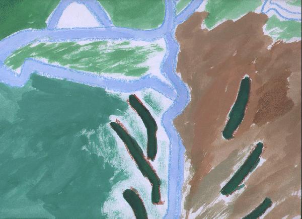 5,「信玄堤」のしあげは堤防です。それまでこう水が毎年のように起きていて田んぼや家がこわされていました。竜王から下流は「かすみ堤」という特別な堤防で集落や水田を水害から守ったのです。